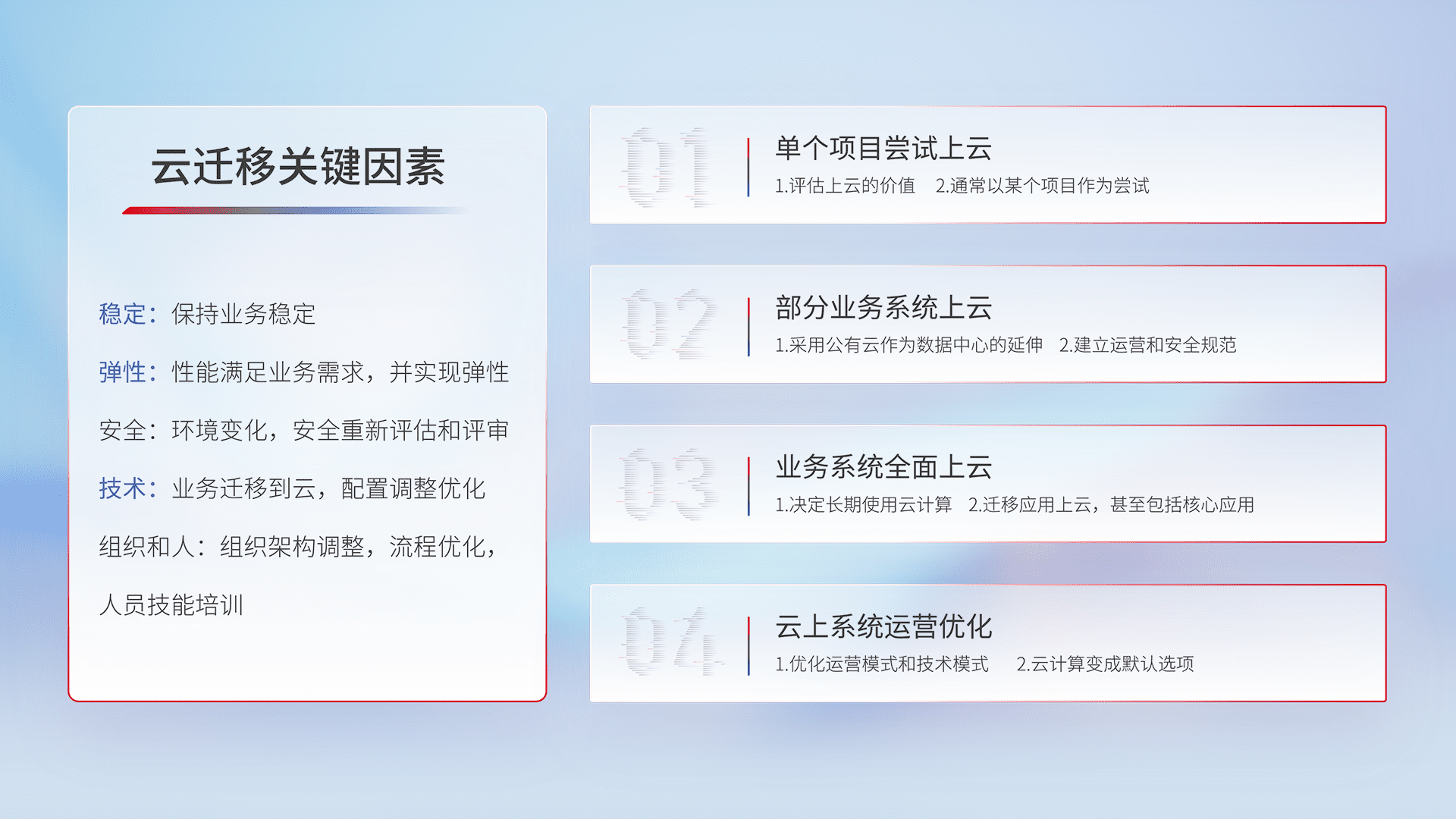 结合实际业务,,,,从规划设计、、云平台选型、、、、云原生改造、、、数据迁移、、、、集成交付,,迁移全过程为客户识别最佳上云路径,,,做好风险识别管理,,,设计网络架构、、身份权限、、、、安全审计合规、、操作审计、、、日志审计、、、监控告警策略、、、、多站点容灾设计等,,对云上基础设施进行整体规划,,,提升IT治理水平,,以满足弹性、、、、高可用、、高性能的需求。。。。
