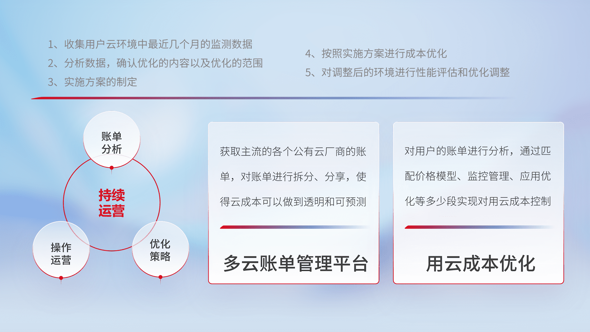 通过多云纳管,,以统一的资源数据模型把客户的云资源进行抽象和封装,,,进而实现对多云资源的统一操作,,保障云资源管理的可靠性、、稳定性与可用性。。。量身定制化运维内容,,,,配置、、、开发运维、、、、补丁管理、、、备份、、监控、、、、认证和访问管理、、、审计和日常巡检等,,,,保障在用云过程中的可靠度,,,稳定度以及高可用率。。